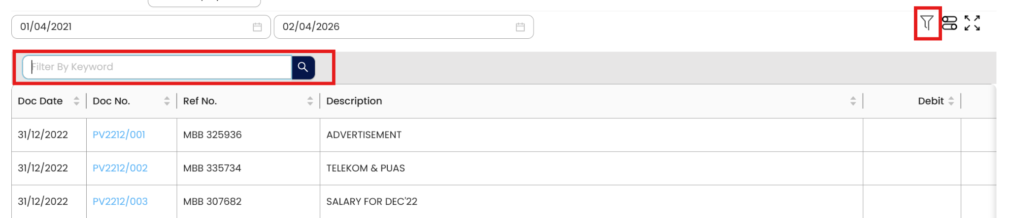 You may also click the Show Filters Icon to display the Search Bar where you can input keywords relating to your bank statement transaction and can look up from any of the Columns displayed.