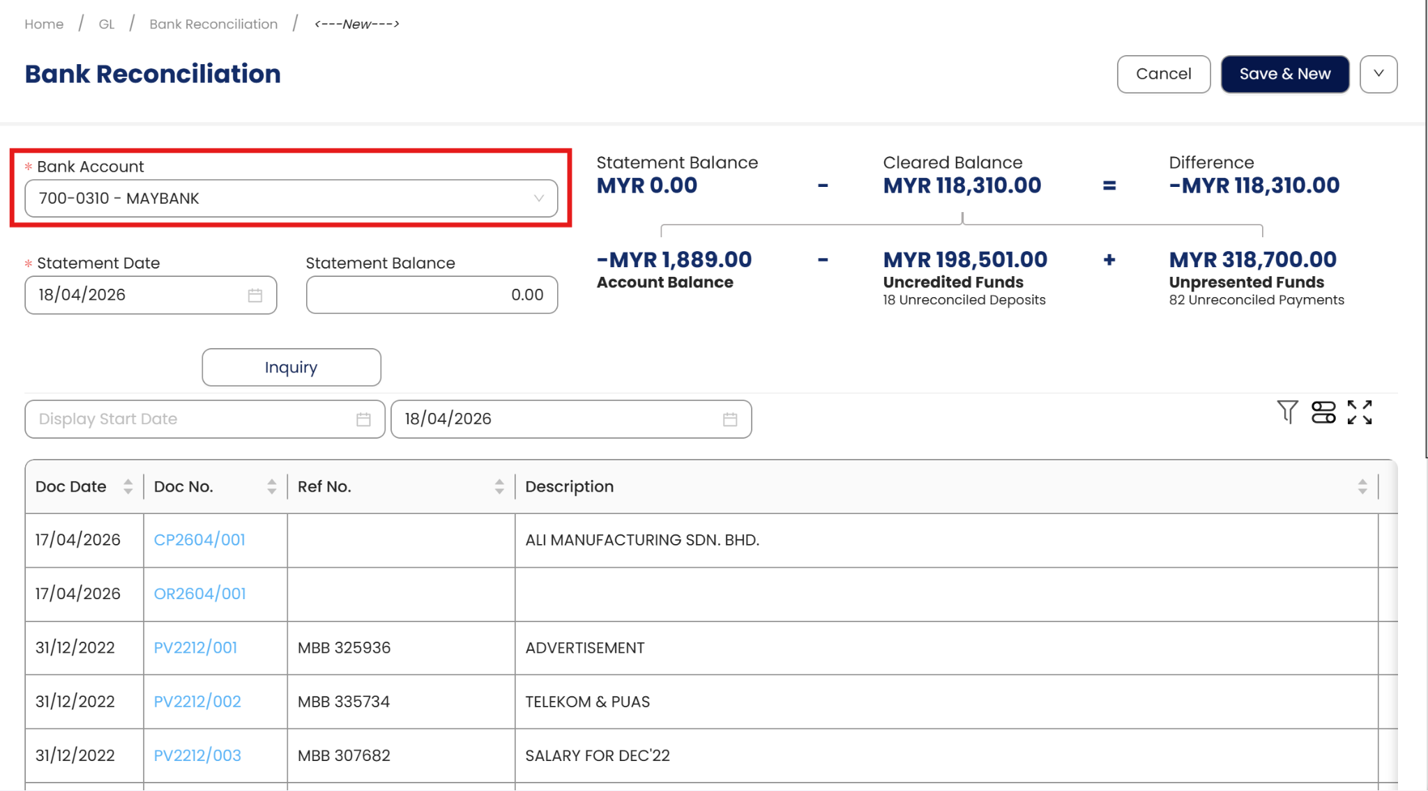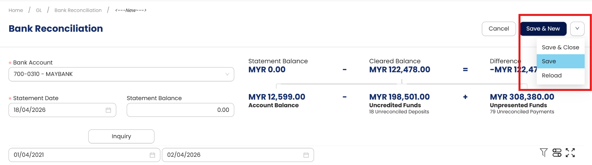 Choose the corresponding Bank Account to reconcile. Statement Date is automatically set to current date, modify if necessary and then input the Statement Balance as of your Statement Date. Next, click ‘Inquiry’. Balances