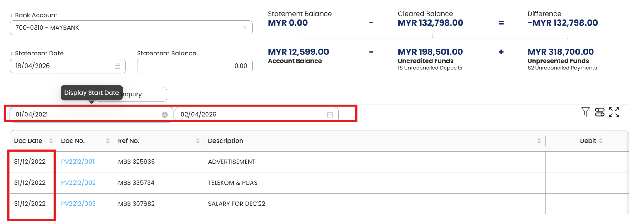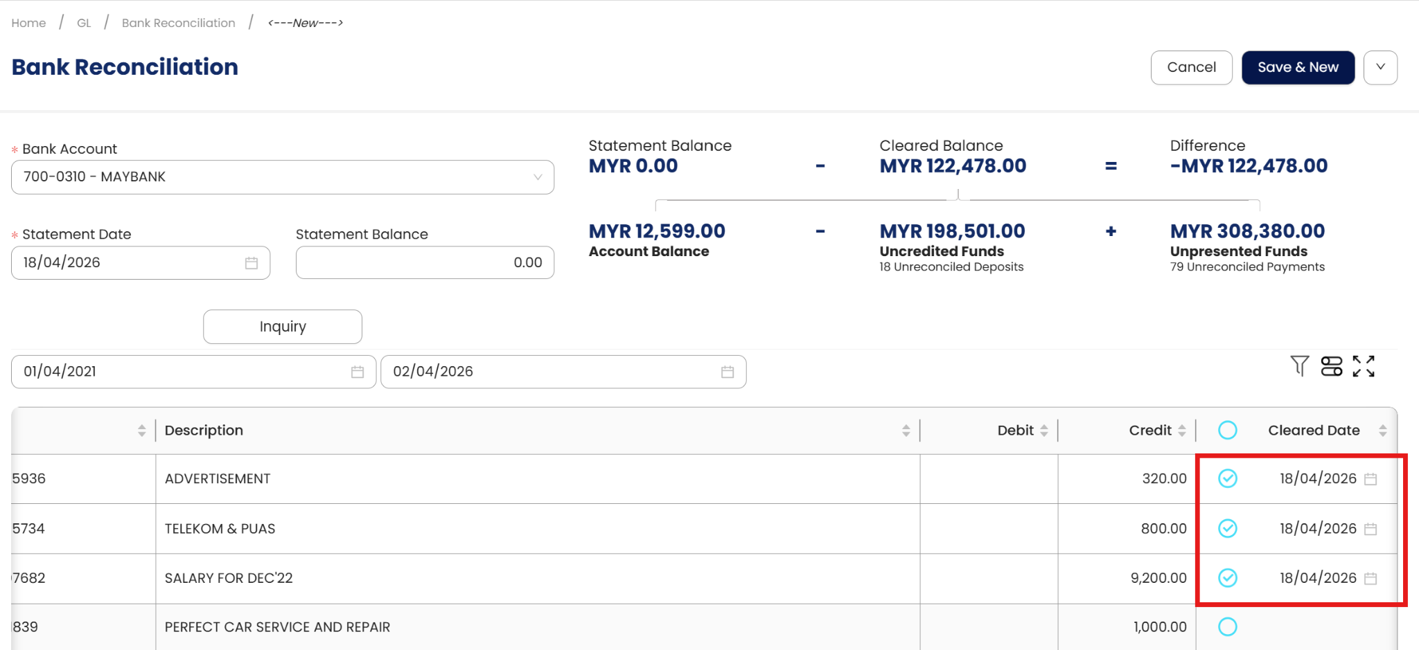 Start matching each bank transactions against the transactions entered in the system. Tick ‘Cleared’ for every matched item. The date when it has been cleared from the bank should be taken into consideration, which needs to be defined it in the Cleared Date Column.