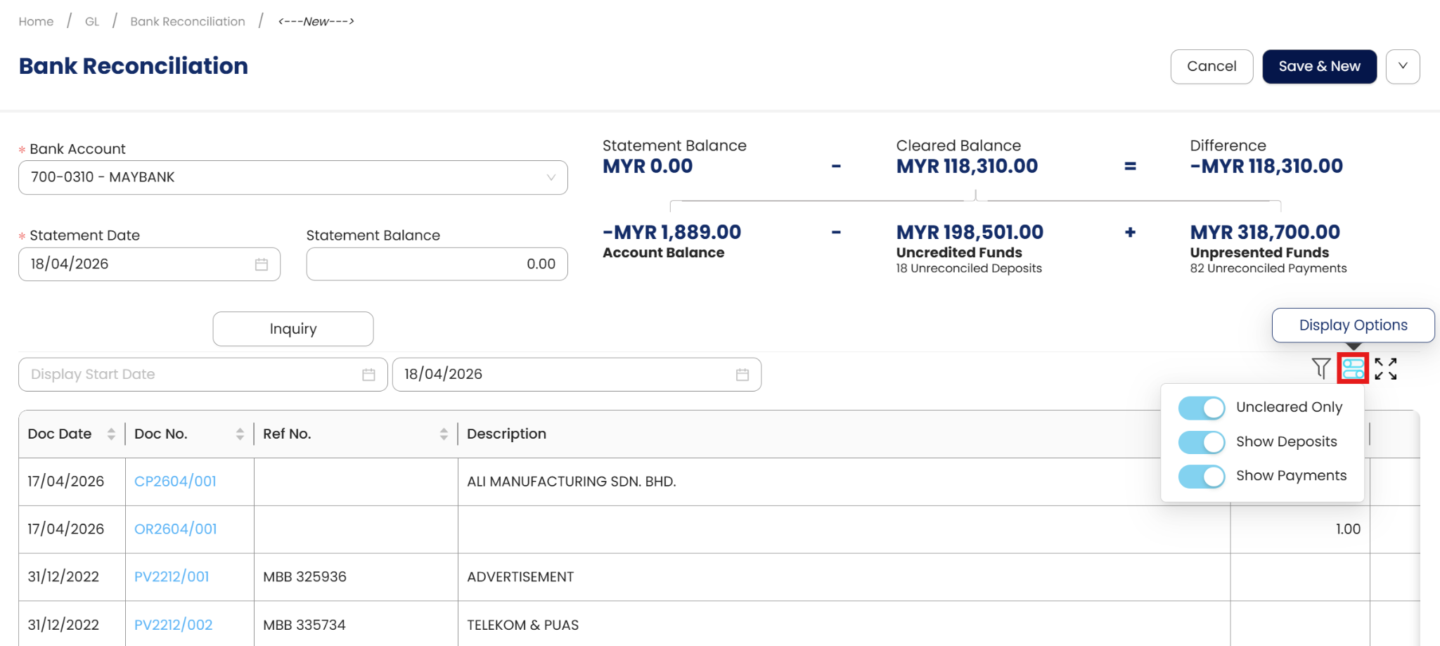 To easily search for the exact transaction to reconcile, you may filter the displayed transactions either using this Display Options Toggle: