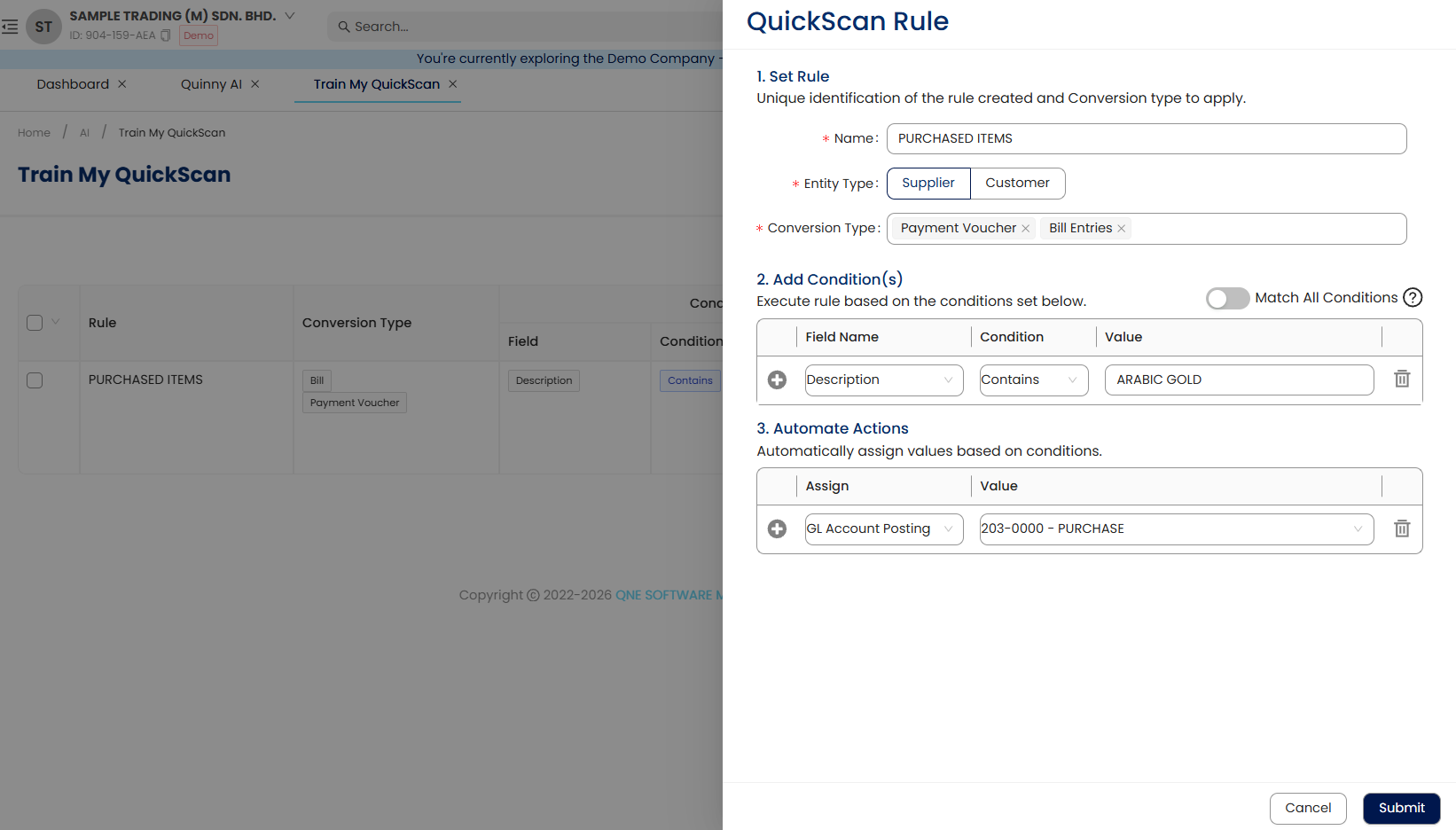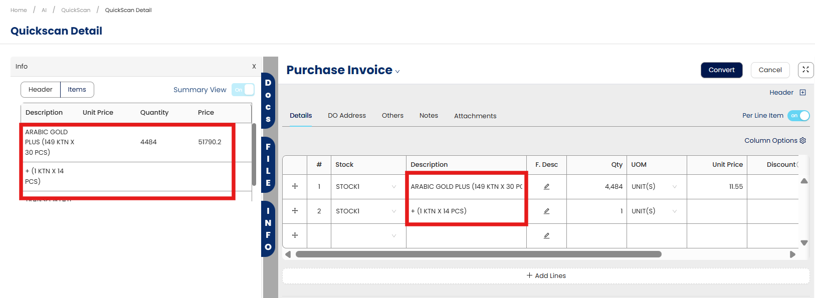 As shown above, upon detection of the keyword - 'ARABIC GOLD’ from the sales invoice, system automatically uses the correct posting GL account code when converting the document data into a Bill entry in the system.