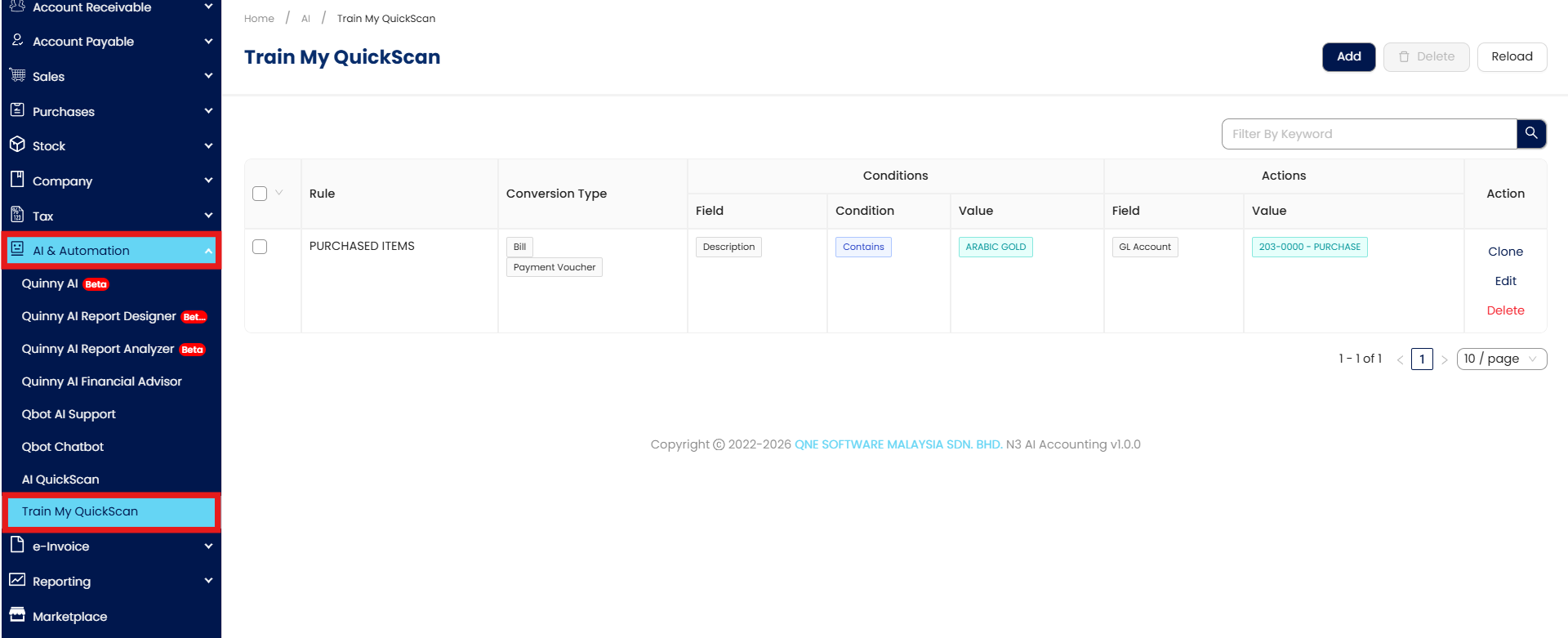 AI Module in N3 AI Accounting uses OCR technology to scan and convert soft and hard copies of transaction documents into transactions in the system. Utilizing the keywords that was saved by the user themselves,once system detected keywords from the scanning, it will automatically uses the corresponding GL Account that was pair with these keywords to create the transaction record in the accounting system.