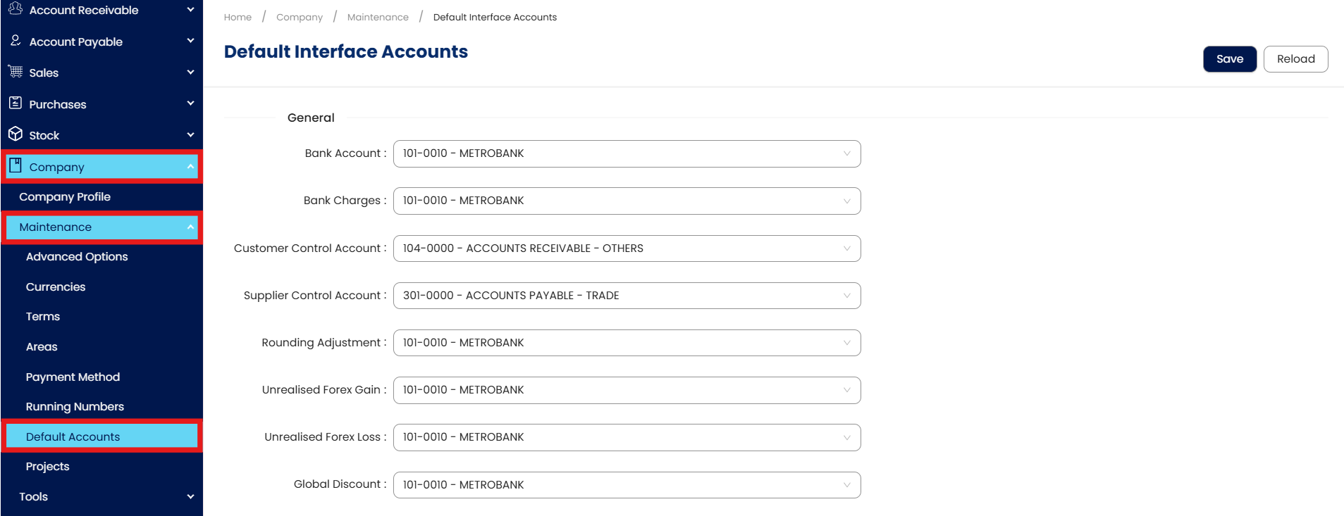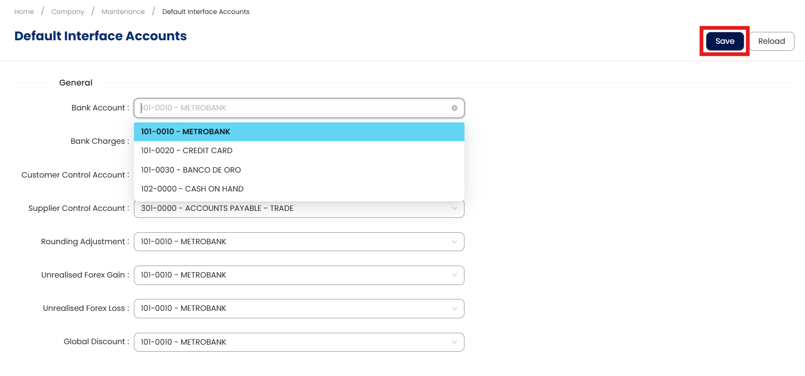 Under the Default Interface Accounts list, simply selects the GL Account codes with its corresponding Default Accounts Type. Once done, click on Save to update.
