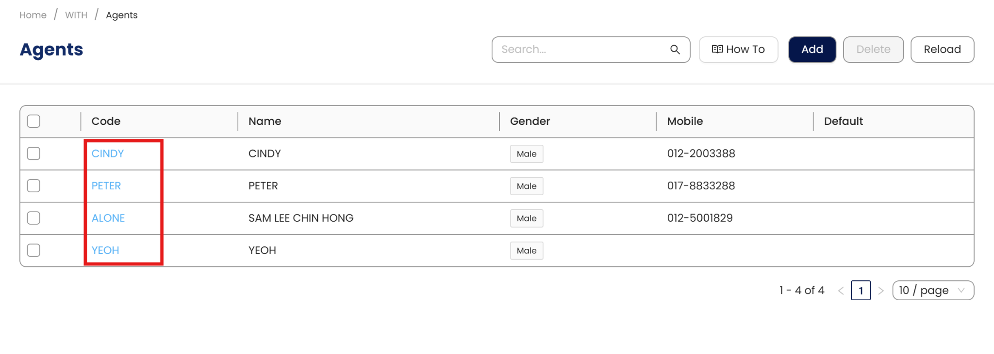 For those Agents that are used in Maintenance and Transaction you may opt to Deactivate it the agent instead, so that it will no longer be used in any forms. Go back to the Agent list view and open the Agent details by clicking the code.