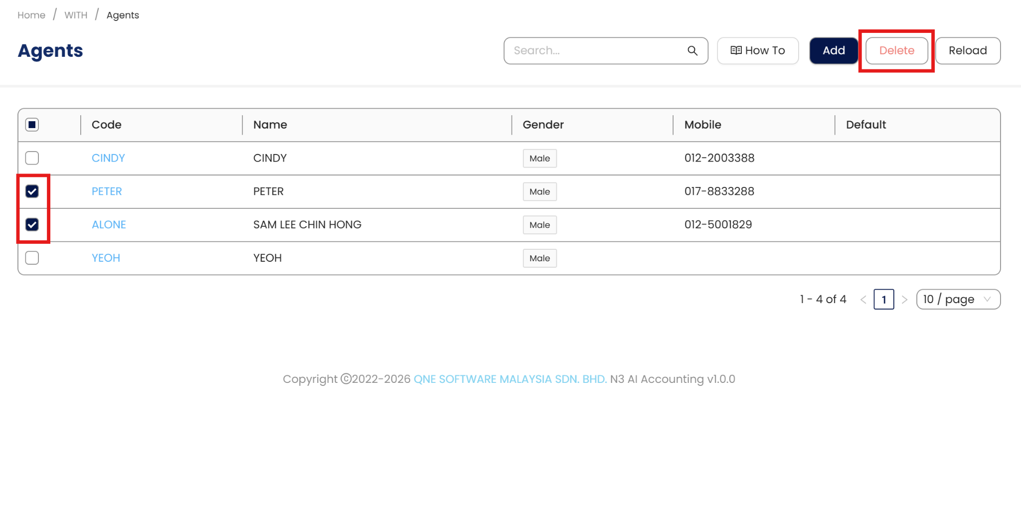 Agents that are not used in Maintenance and Transaction can still be deleted by going back to the Agent list view and ticking the desired agent for deletion.