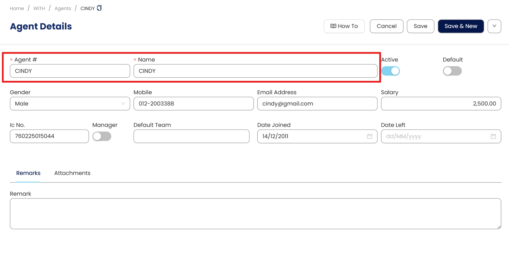 The system shall display a NEW screen to allow you to fill in the information of the new agent. Enter the Agent code, which will serve as a unique code for each agent, along with their name.