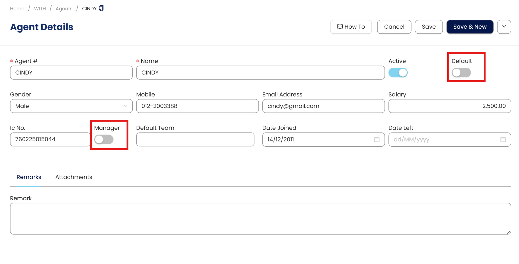 Additionally, you can toggle the 'Default' button to set this agent as the default option when creating a customer. Use the 'Toggle' button to indicate if the agent is a Manager. Once you are done, click on 'Save'