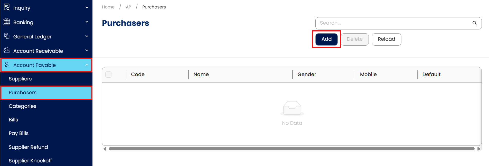 In navigation pane, go to Accounts Payable > Purchaser. Click “Add” to create a new purchaser code.