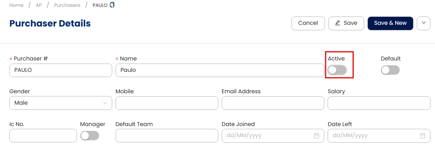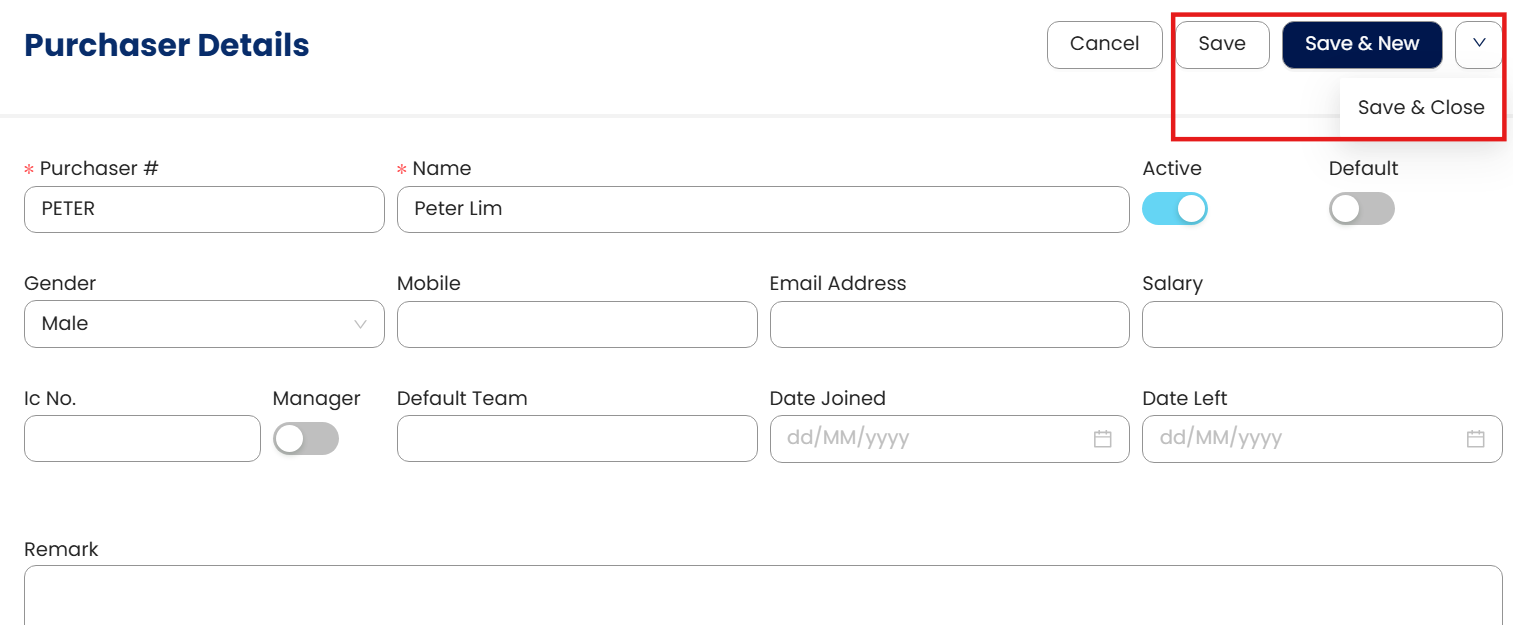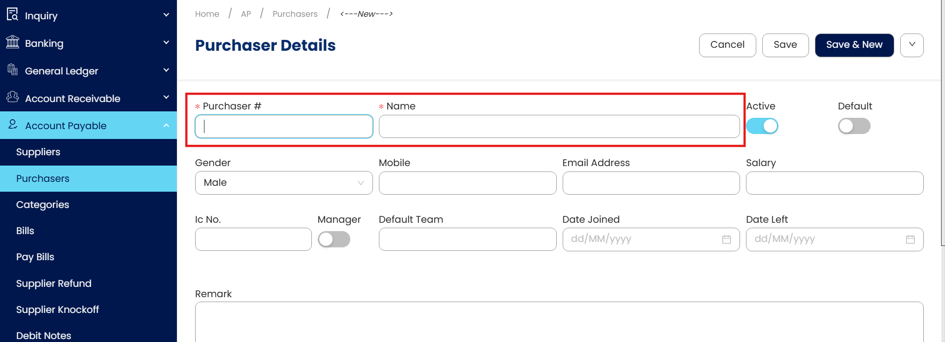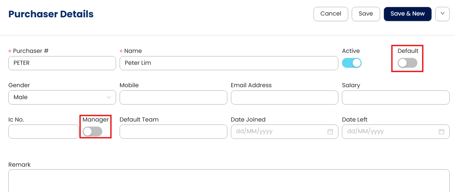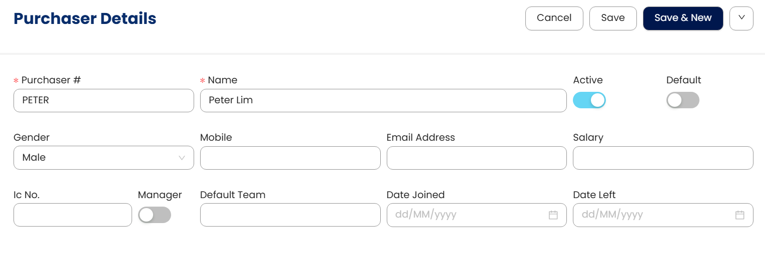 In the Purchaser Details form, enter the Purchaser #, which will serve as a unique code for each purchaser, along with their name.
