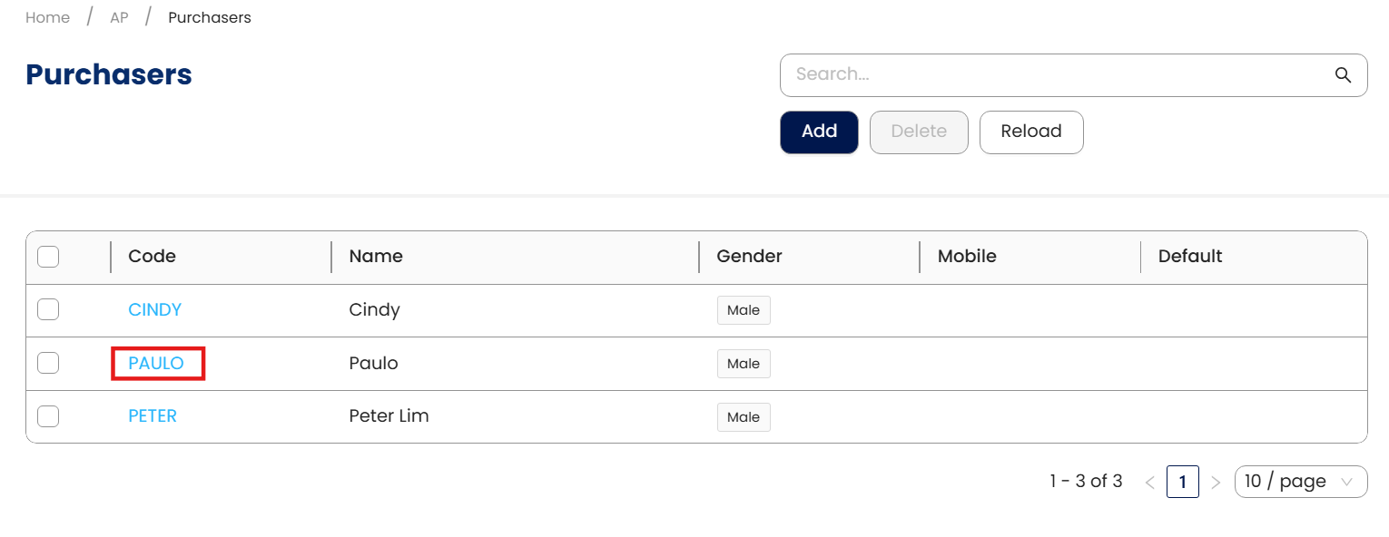 Go back to the Purchaser list view and open the Purchaser details by clicking the code.