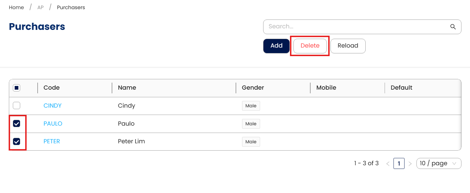 Purchasers that are not used in Maintenance and Transaction can still be deleted by going back to the Purchaser list view and ticking the desired Purchaser for deletion.
