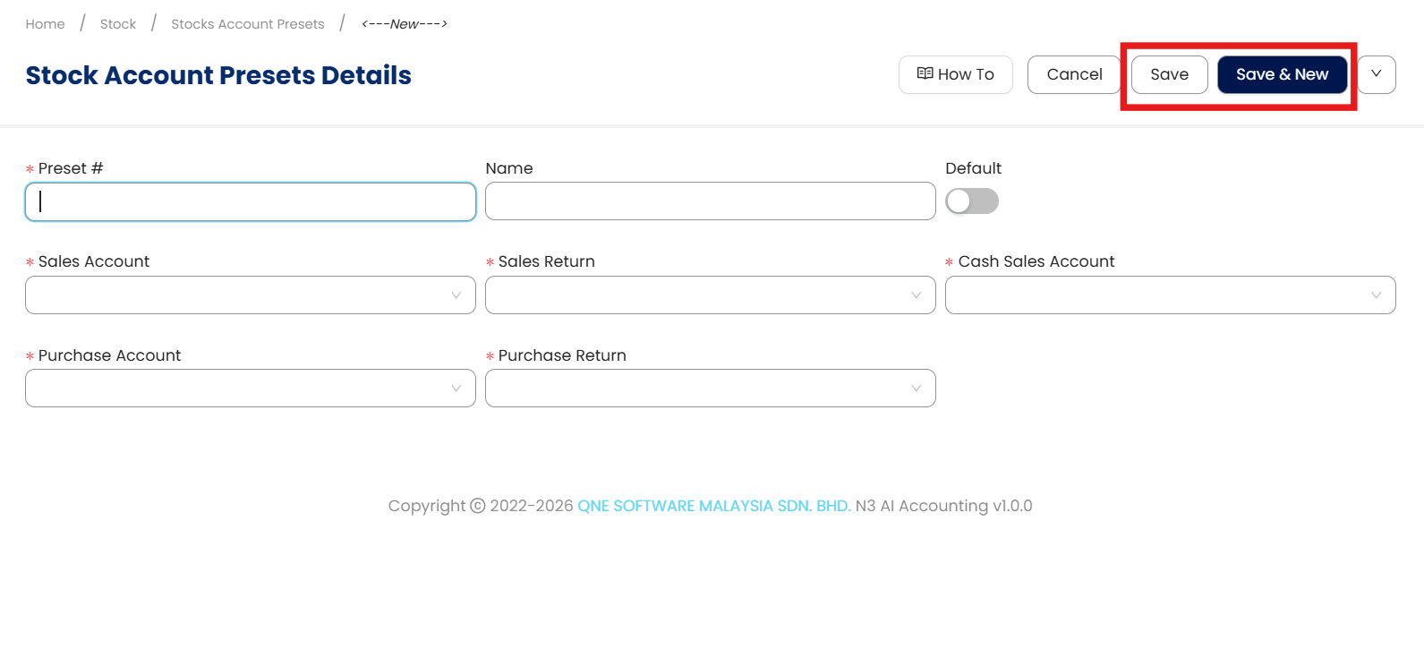 System will open a new Stock Account Presets Details screen. Input the Preset Code and Name, then you can enable the Default button if you want to set it as a default preset.