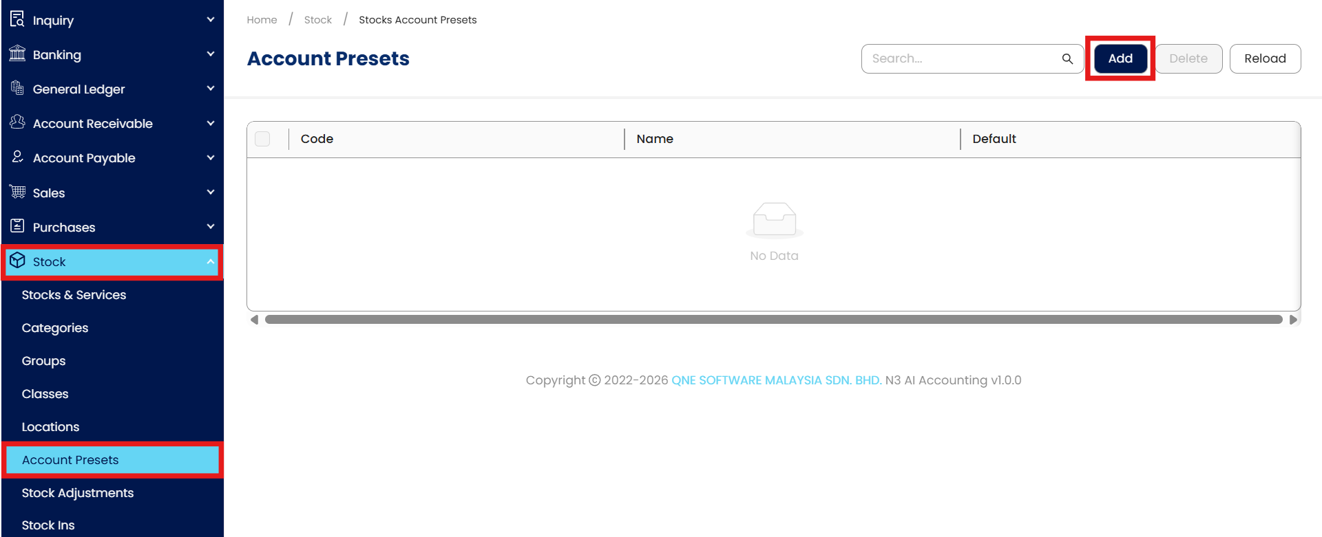 It is a compulsory field when creating a stock/service item. From the Navigation Pane, click on Stock and choose Account Presets. Click on “Add”.
