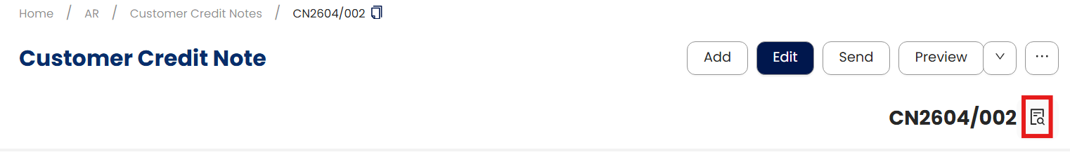 From the Navigation Pane, click Account Receivable then choose Credit Notes. Click the Add button in the upper right to create your new CN transaction.