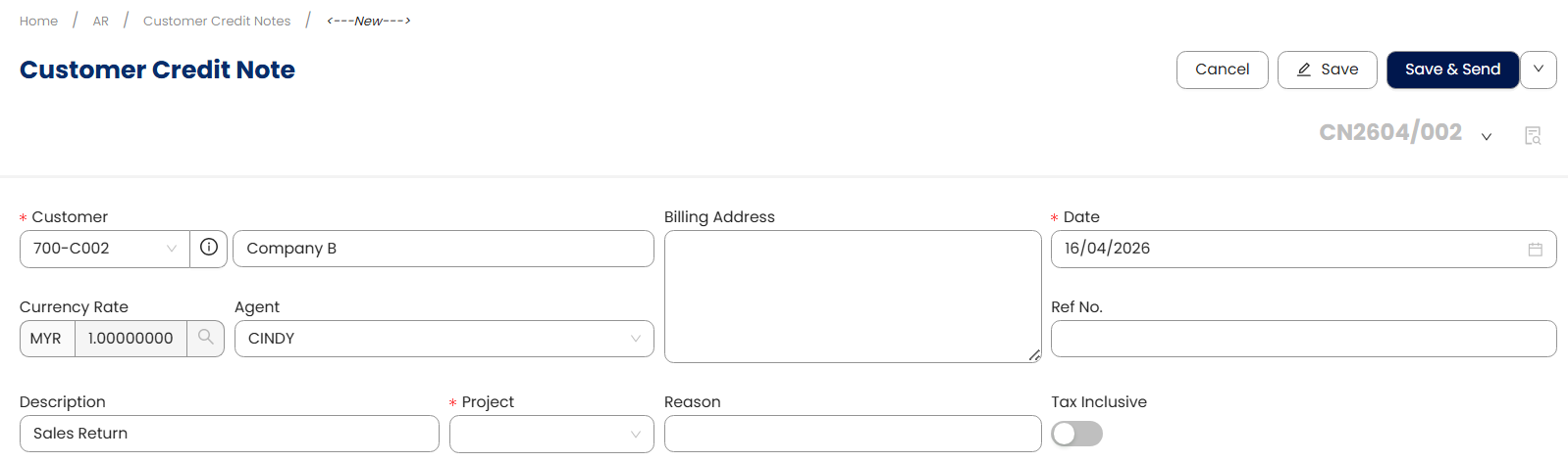 In the Customer Credit Note form, select your Customer and so the system will display all the default information.