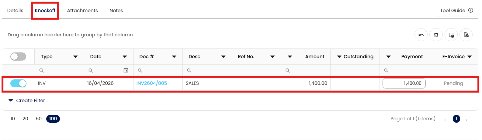 Next, proceed to the Knockoff tab to match it to the Invoice and directly deduct it to your receivables, this shall automatically reflect the remaining outstanding amount as shown.