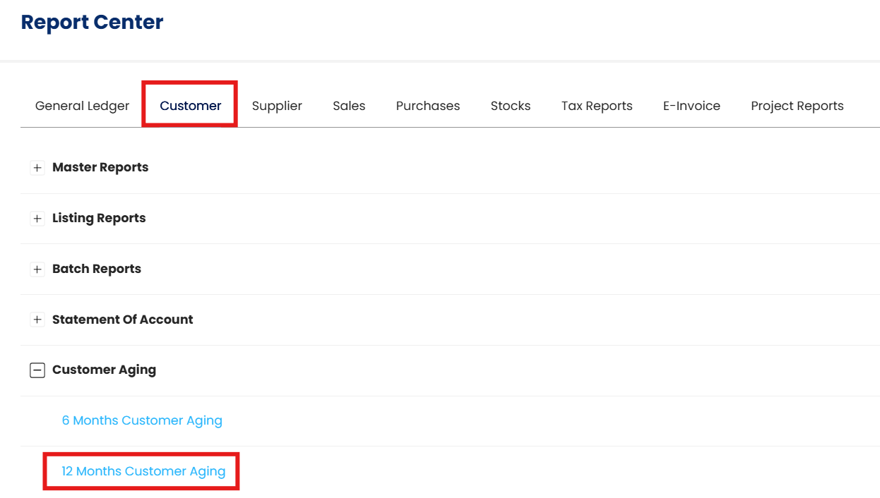 In the same Report Center Screen, select Customer Tab and expand Customer Aging, then choose 12 Months Customer Aging.