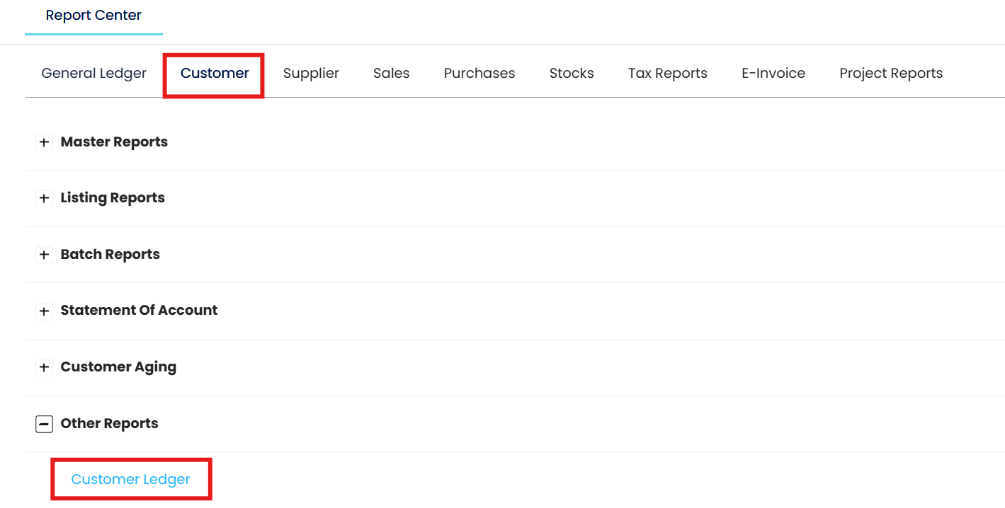 To generate this report, navigate to the same Customer Report Center, expand Other Reports and choose Customer Ledger.