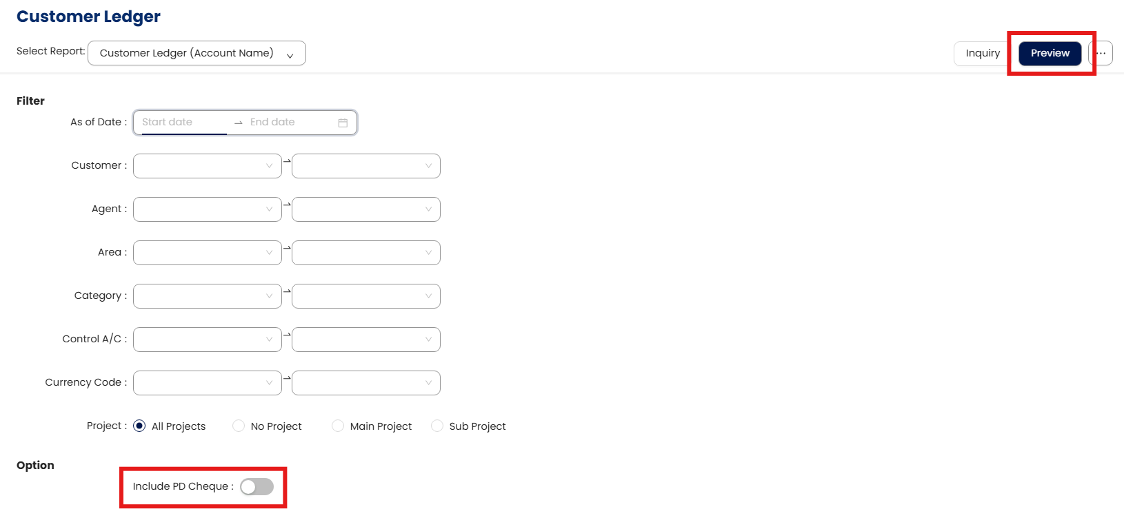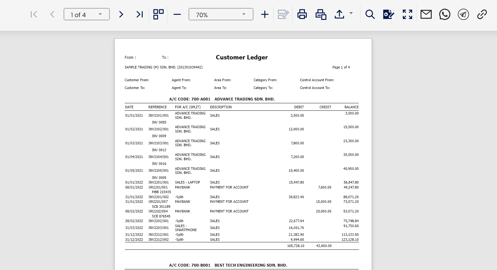Click Preview button to generate your Customer Ledger Report containing all the journal postings of each of the customer accounts transactions.