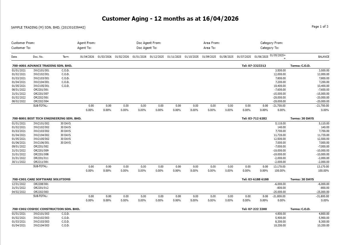 In N3 AI Accounting (formerly QNE AI Cloud Accounting), you may generate 12-Month Customer Aging Report to trace overdue transactions of your customer by month.