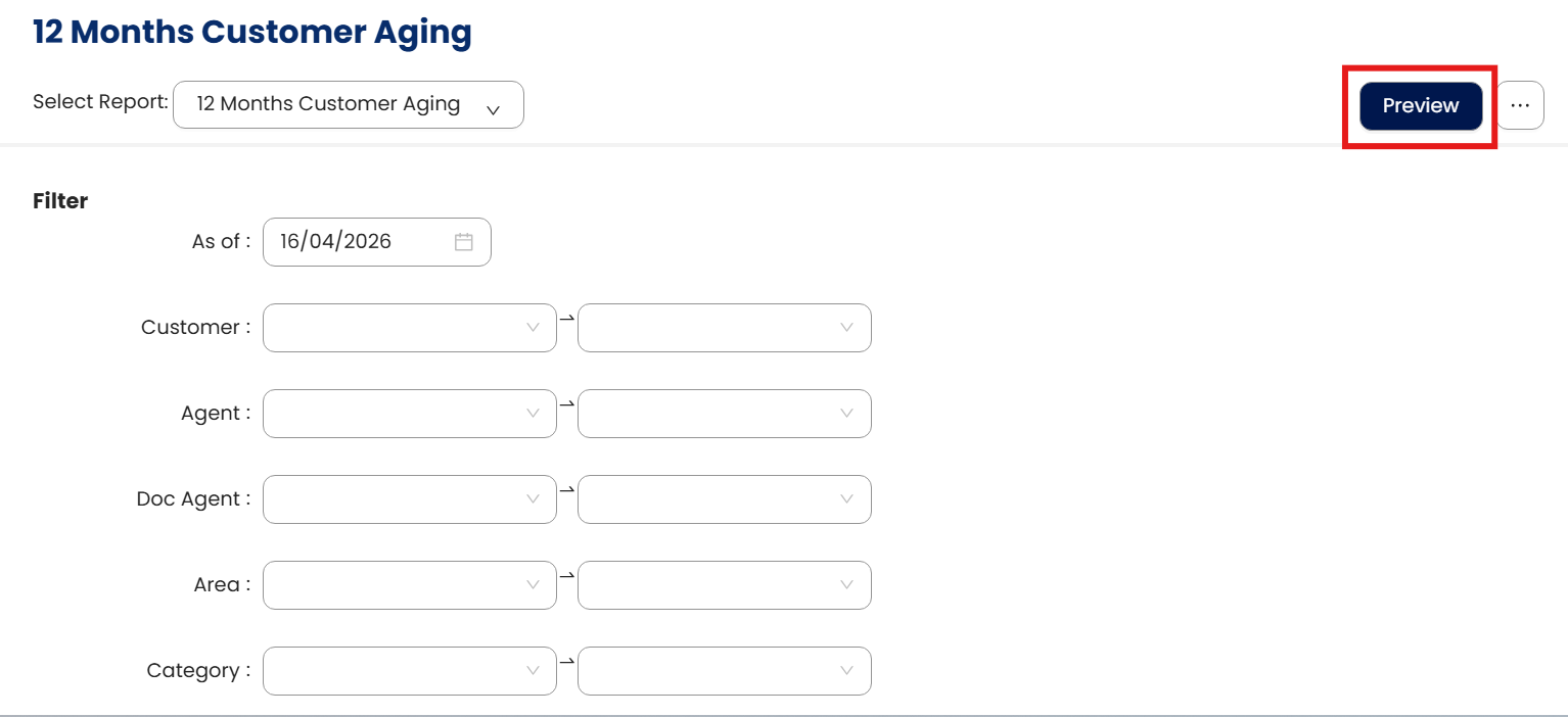 Filter to the desired output you want in your report. Set the Date Filter. And Filter Range for Customer, Agent, Doc Agent, Area, Category, and Control Account according to your needs.
