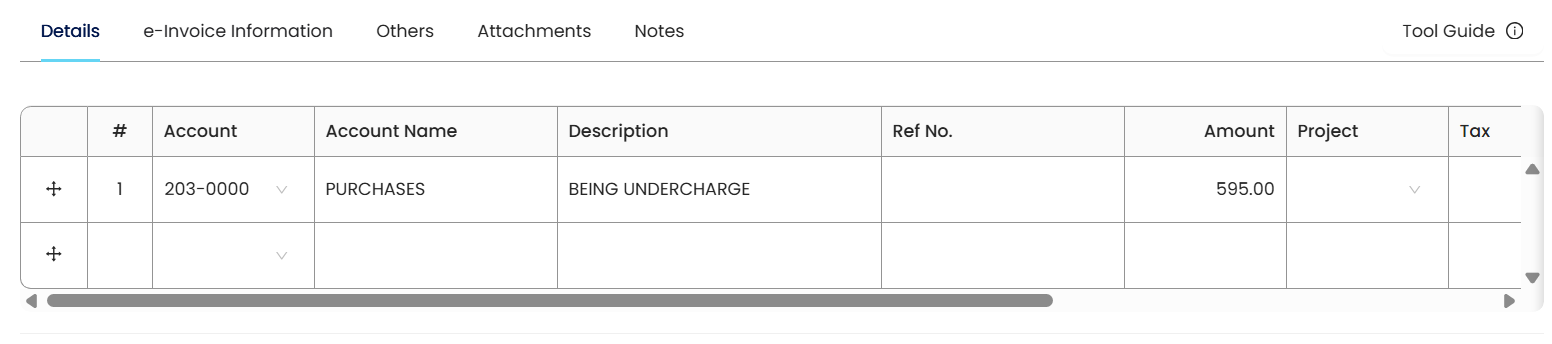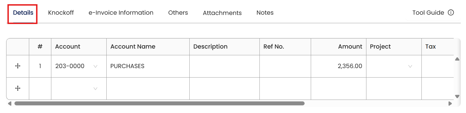 On the lower part of the screen under Details tab, search for the GL Account under Account Column to represent the debit entry of the transaction. Replace the Item Description and input the Item Ref No. if necessary. Input the Amount and select the Tax Code if applicable.