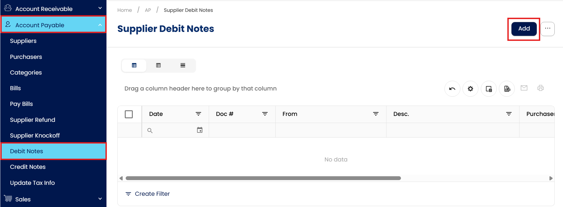 To create Supplier Debit Notes, go to the Navigation Pane, expand Accounts Payable and click on Debit Notes. From the Debit Note List View Screen, click the “Add” button to create a new Debit Note form.