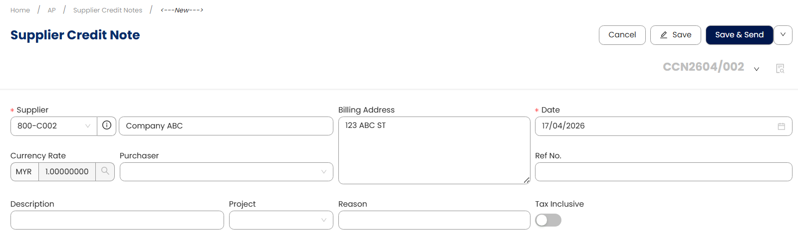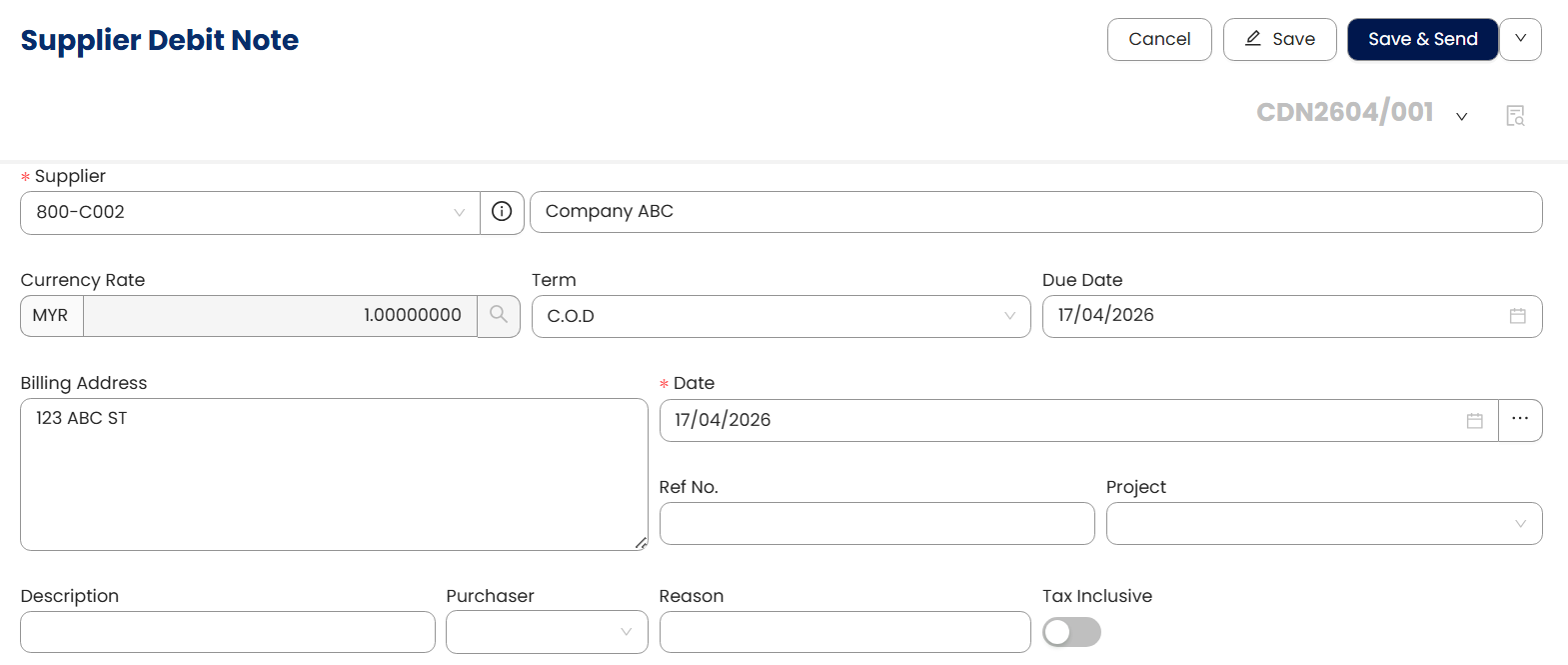 Select your Supplier, input the Doc Date and enter the other information needed such as the Purchaser, Reference No., Description and Reason. Toggle Tax Inclusive/Exclusive option if applicable.