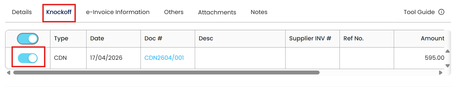 Next, Match the Credit Note with the corresponded unpaid Bills or Debit Notes that are listed under the Knock-Off tab.