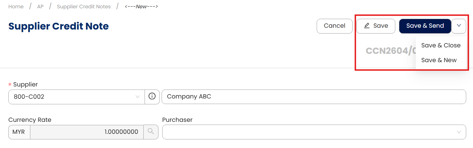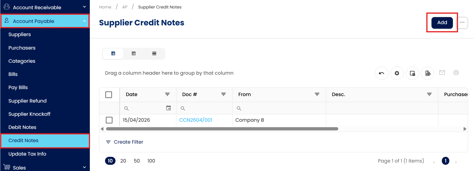 To create a Supplier Credit Note, go to the Navigation Pane, expand Accounts Payable, select Credit Notes. Similar to the other previous screens, it will list all the saved Credit Notes for the users to manage easily. Click the “Add” button to record a new transaction.