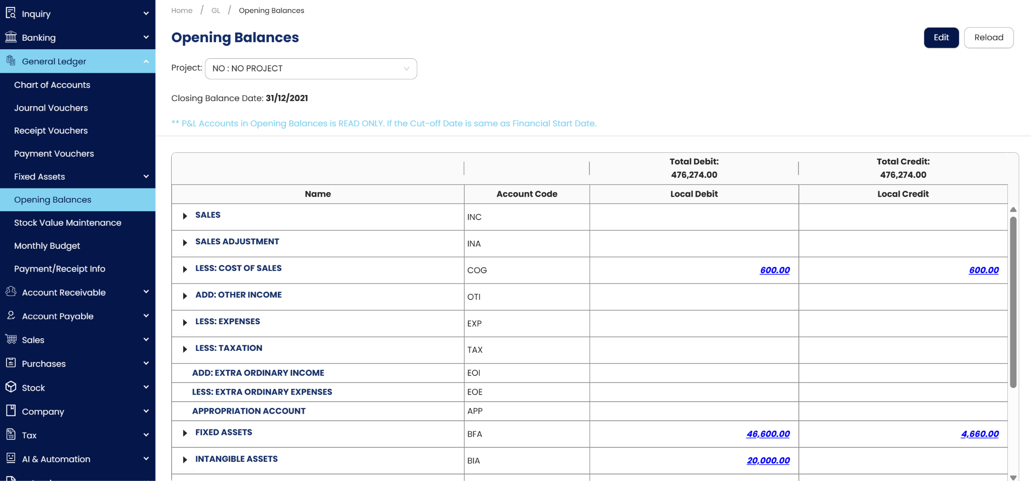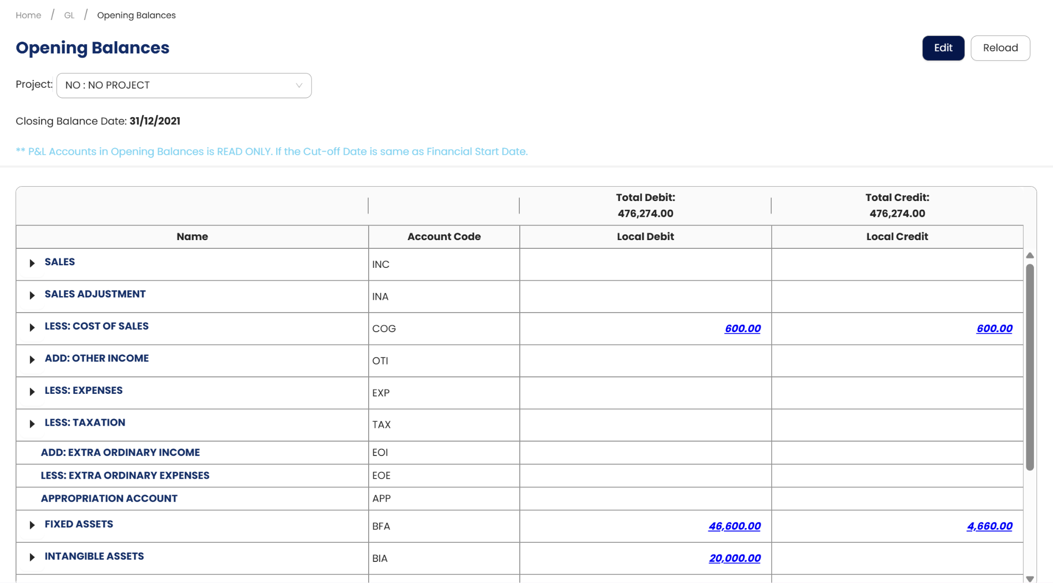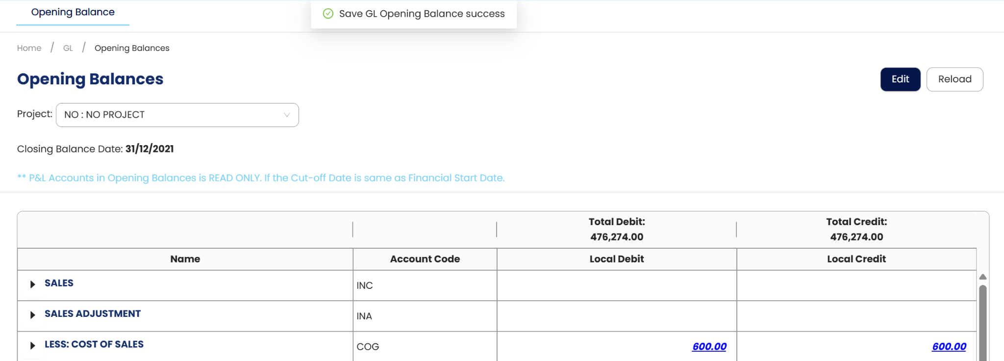 4. Once done, click Save. The system will allow the user to save the GL Opening Balance even Total Debit and Credit Amount has a difference. User can always get back to it until the values are final.