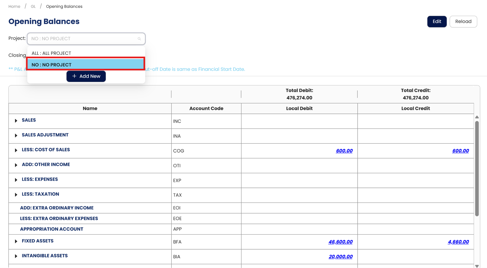 2. Users should first select either a single project or the “No Project” option when entering the opening balance for a GL account code.