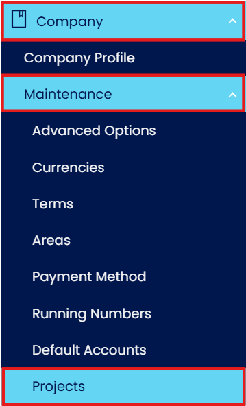 In Navigation pane, go to Company > Maintenance > Projects