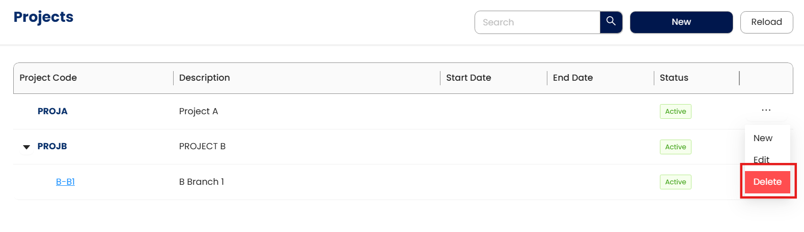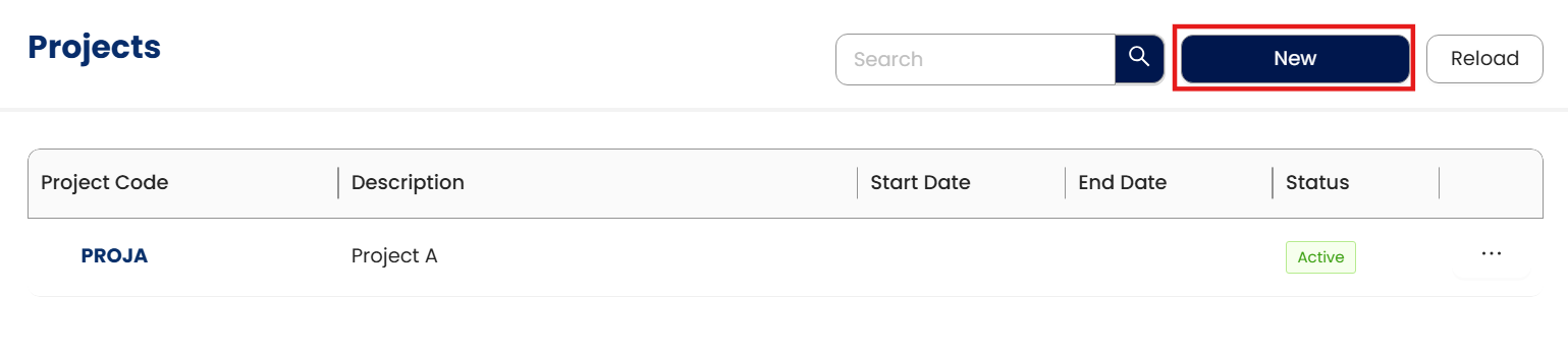 Click New to add a project.
