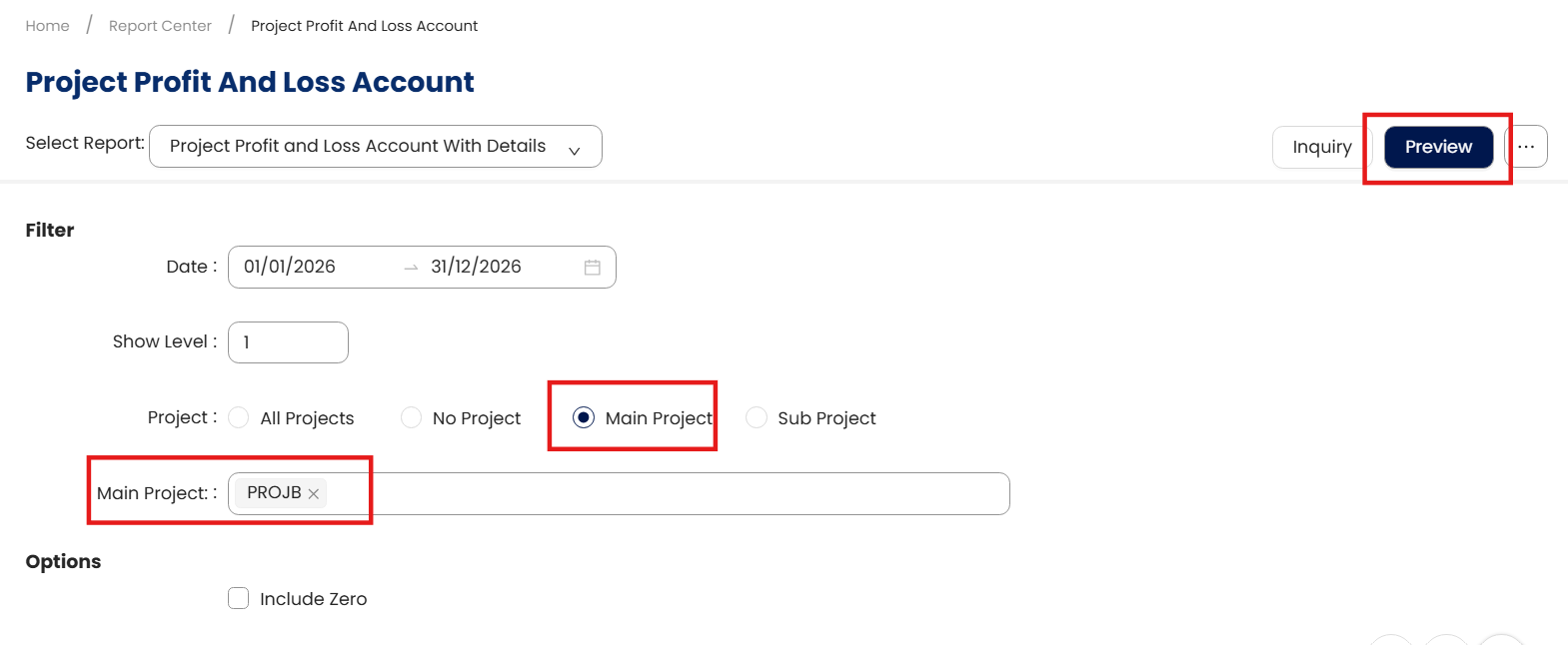 User Allow to Filter Project in order to Preview Project Profit and Loss Account