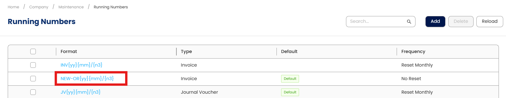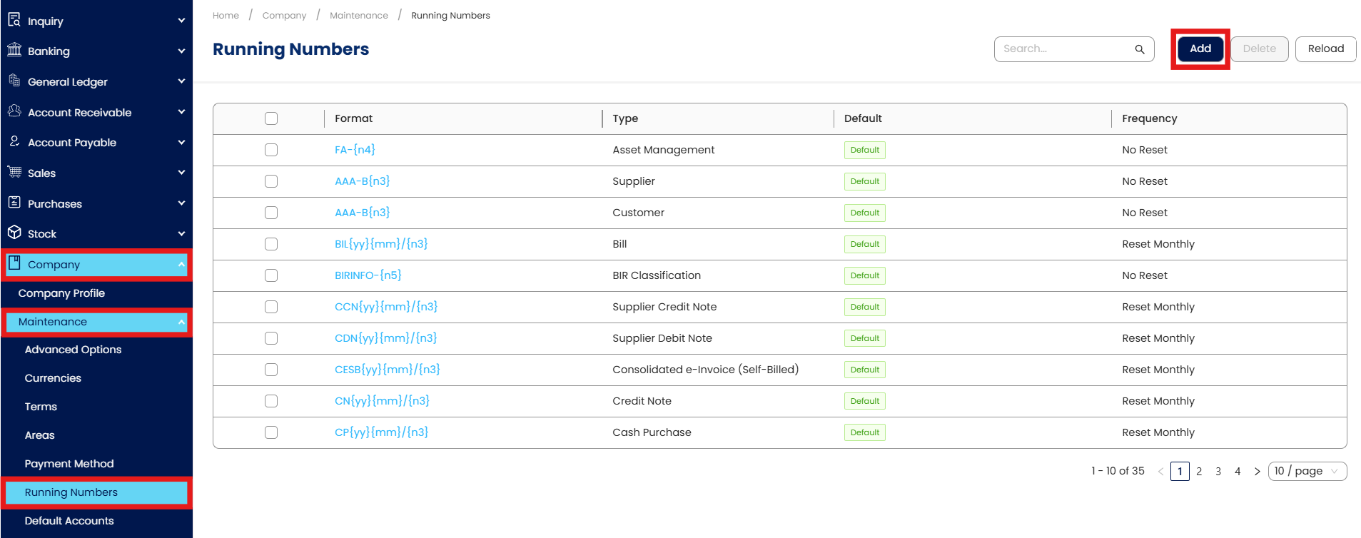 1st - Click Company > Expand Maintenance > Click Running Numbers > Press Add
