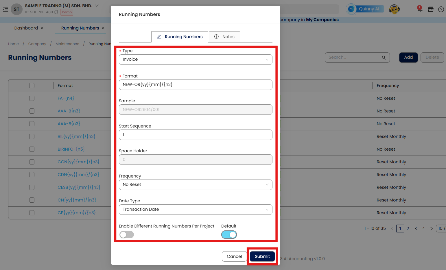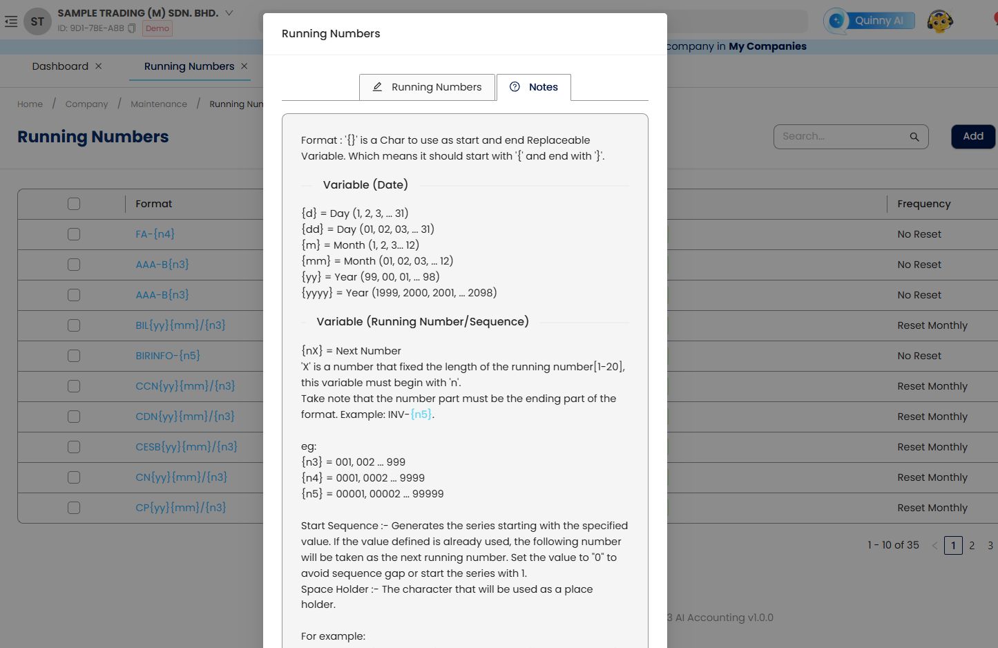 Number series is used to have a multiple kinds of document numbering depending on its use. In N3 AI Accounting, we call it “Running Number”. It will allow the user to use the latest document number upon creating a transaction.