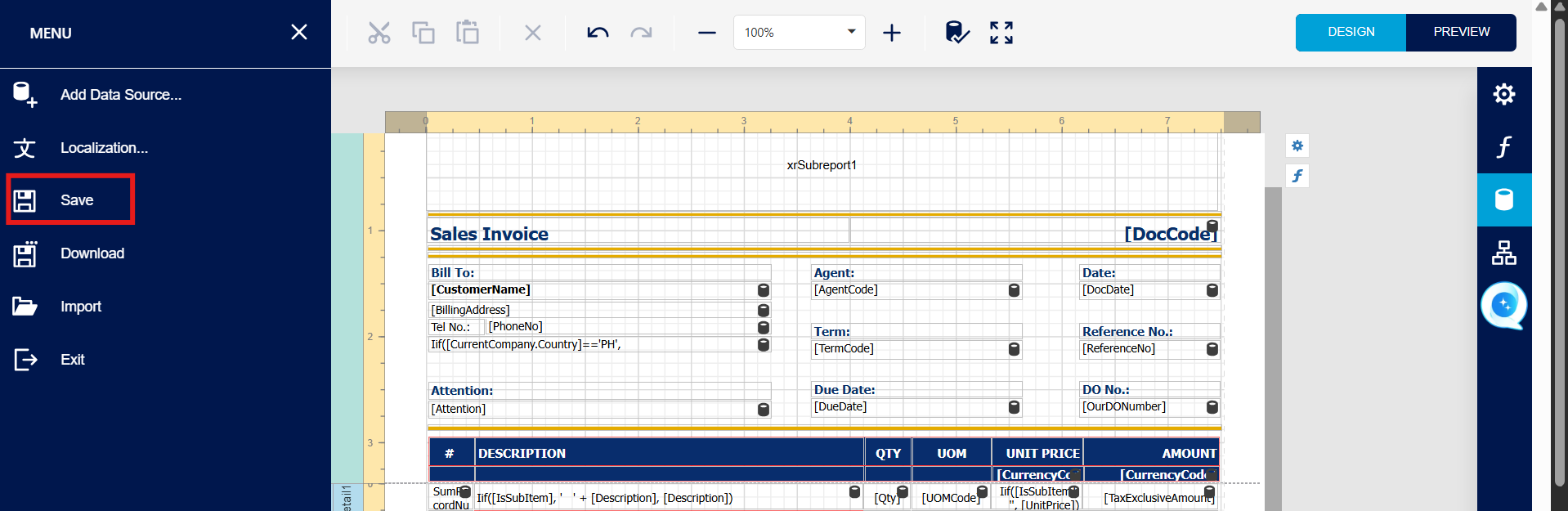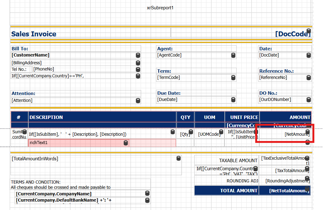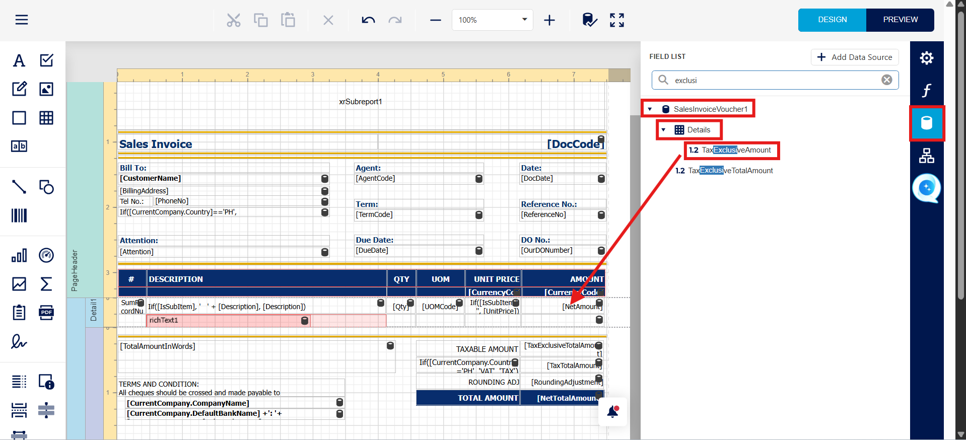 User can Press Field > Expand SalesInvoiceVoucher1 > Expand Details > Drag 'TaxExclusiveAmount' field to the 'NetAmount' Column