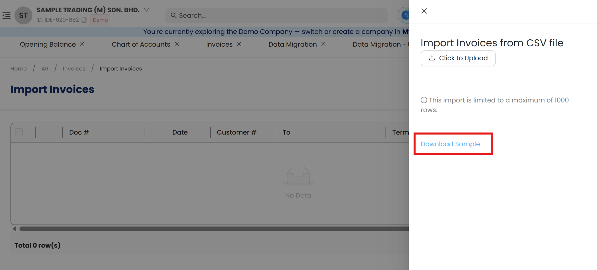 Step 2 - After Press Upload Button, Below Screen will appear, Please Press 'Download Sample' to download a Sample Excel CSV Format.