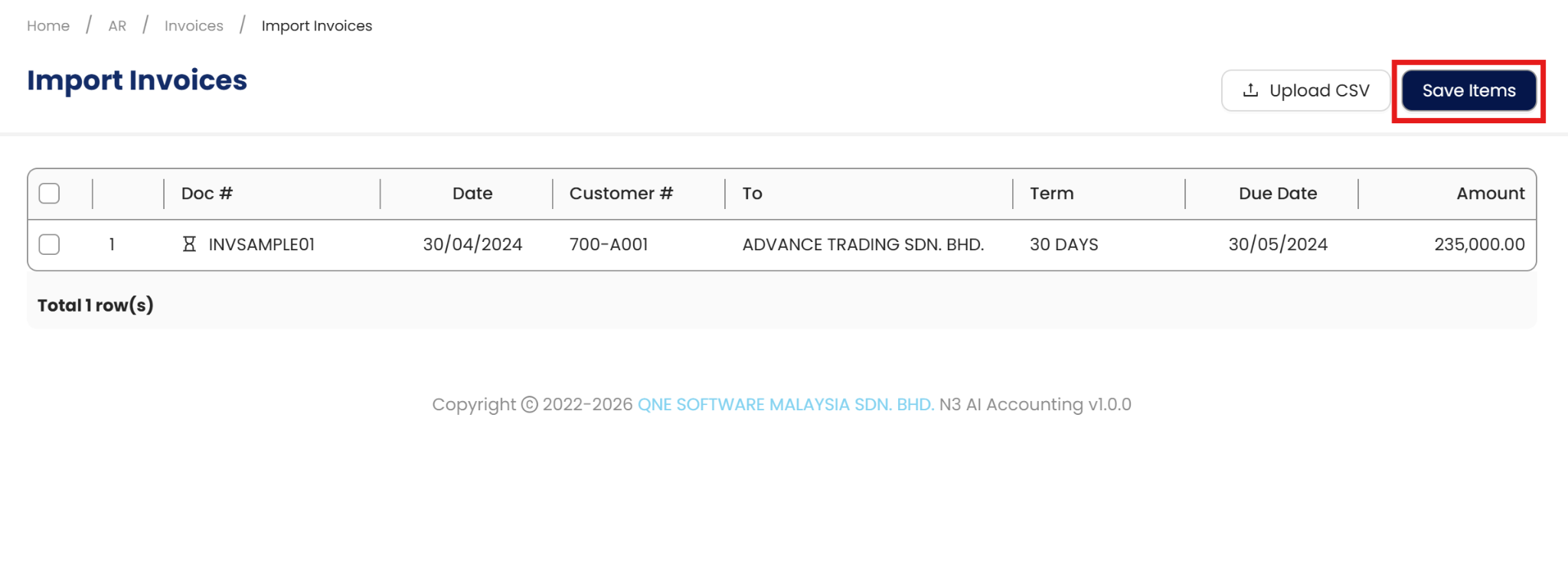 Step 5 - System detected Excel have 3 transactions, Press Save Items.