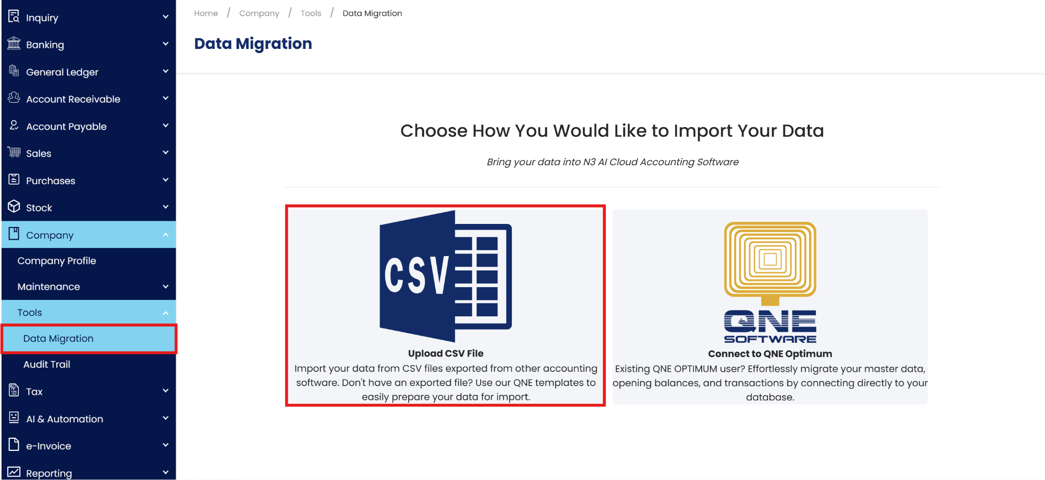 Step 1 - Expand 'Company' > Expand 'Tools' > Press Data 'Migration' > Press Upload CSV Files