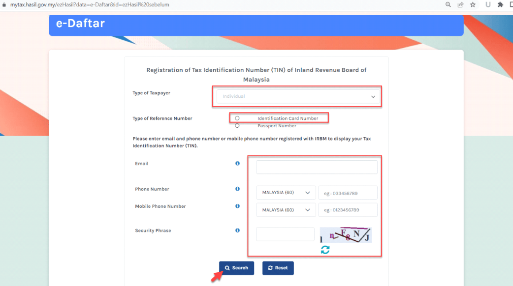 Choose the appropriate taxpayer category, such as individual or company. Fill in the identification number, email address, phone number, and enter the security phrase as prompted, then click search.