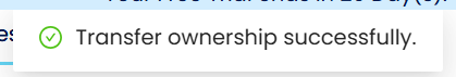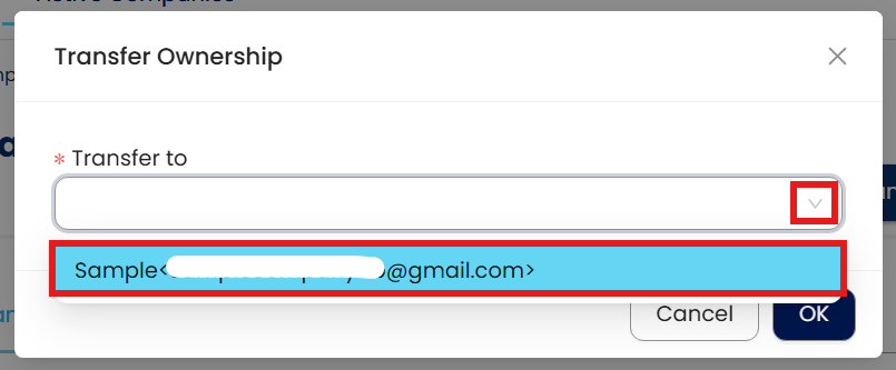 Click on the Transfer Ownership button and the transfer ownership windows box will prompt. Click on the email field and selects the new email from the dropdown list. Click on Transfer complete the process.