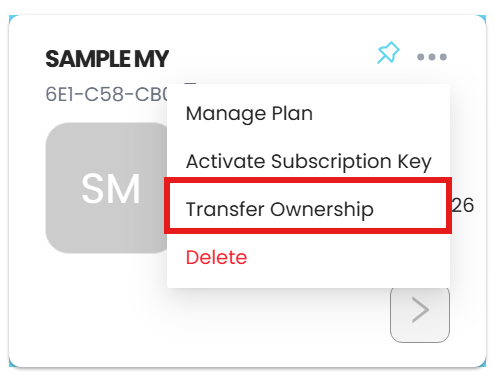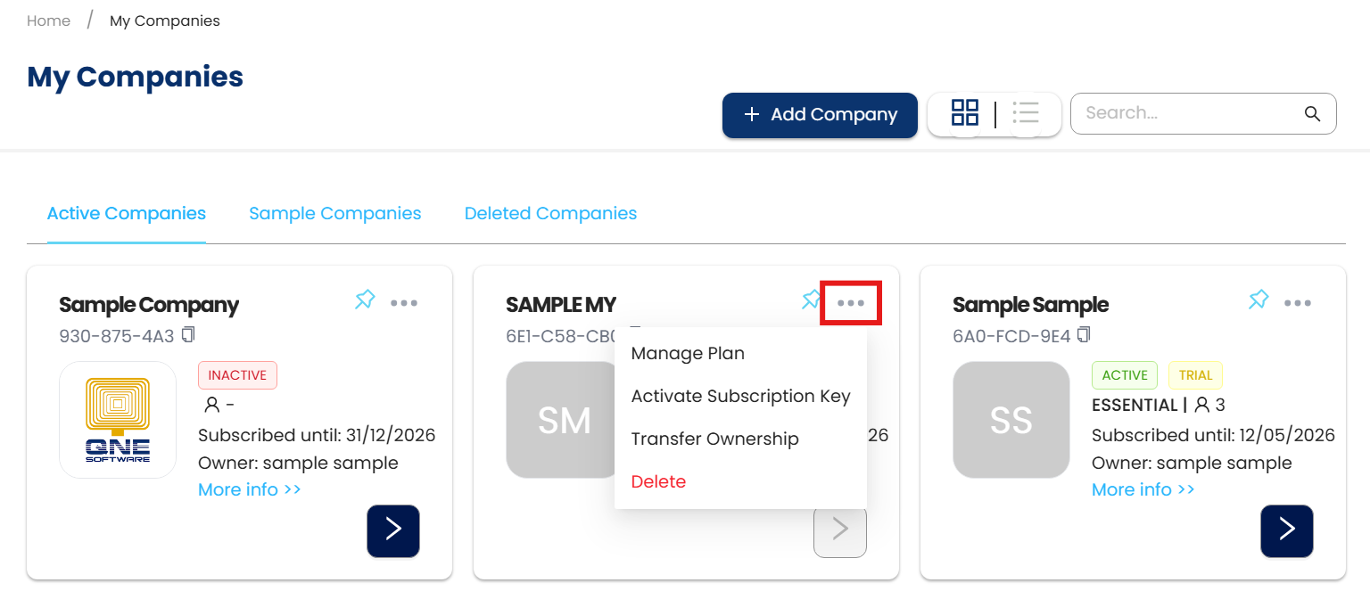 In the My Companies screen, press the three dots button (...), on the company which wants to Transfer ownership.