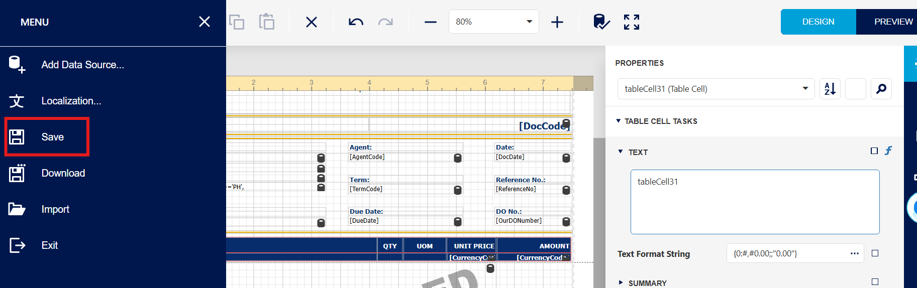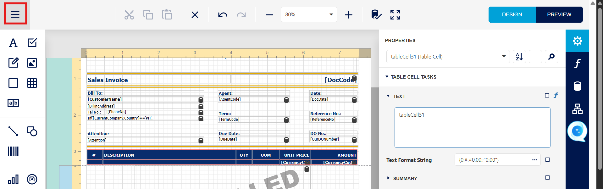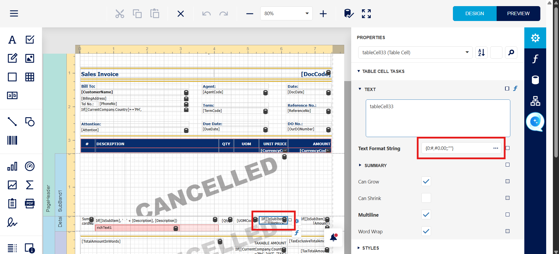 Step 2 - After Access to the Sales invoice report design, Press the Unit Price Field, User will notice the 'Text Format String' field.
