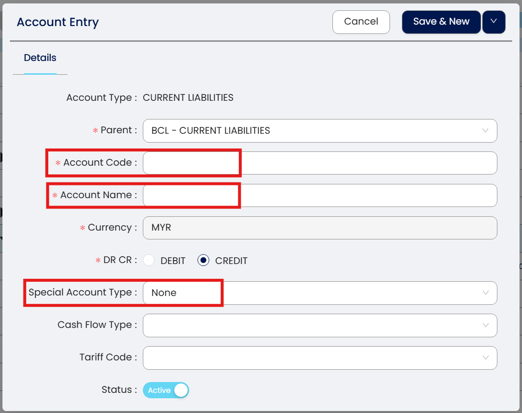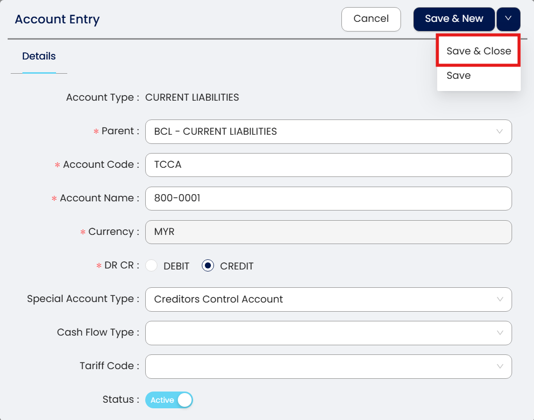 Note: Special Account type please select Creditors Control Account.