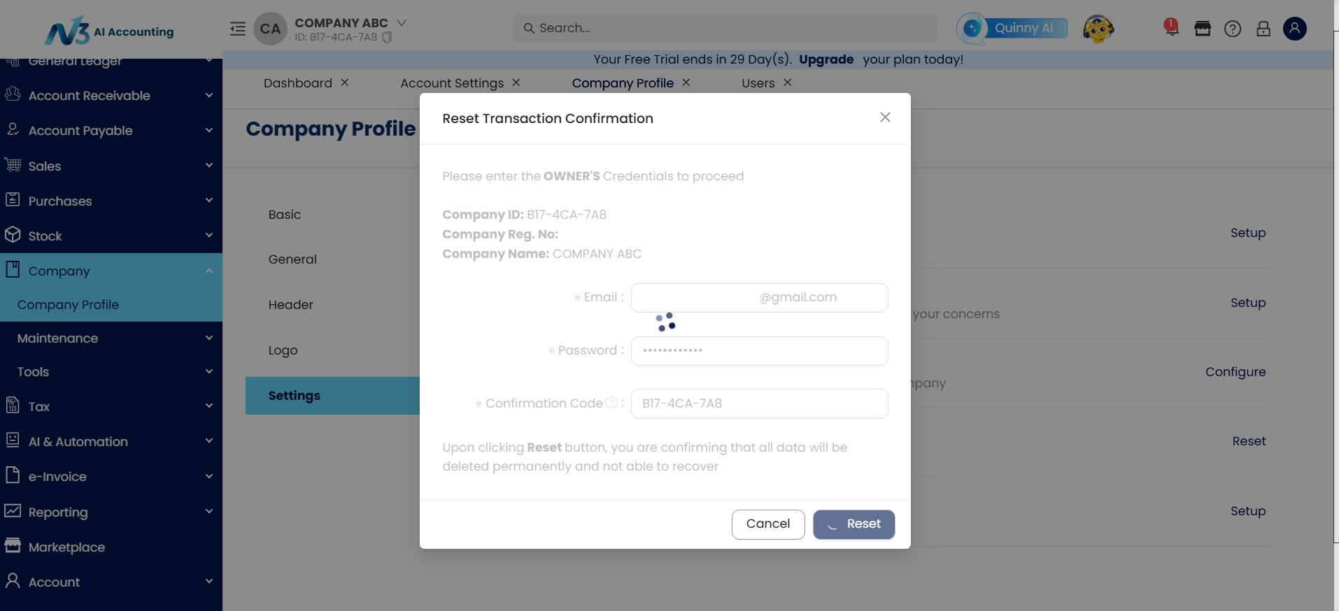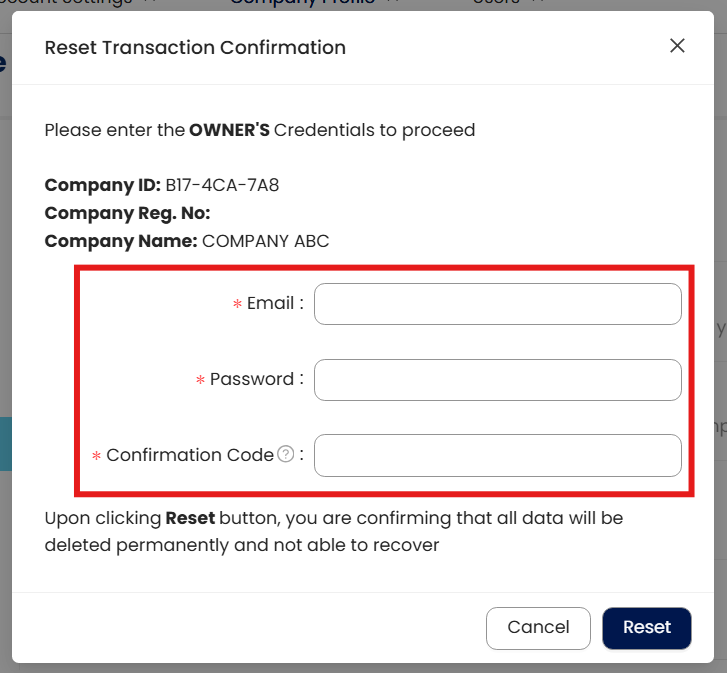 Step 5 - after Press 'Reset Transaction', insert Company ID and please make sure using owner email address and password > Then Press Reset.