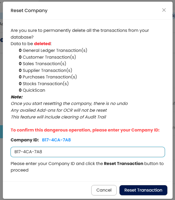 Step 4 - After Press 'Reset', system will prompt out below screen, Type in your Company ID and Press Reset Transaction.