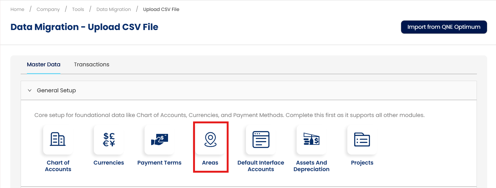 Expand Company > Expand Tools > Press Data Migration > Press Upload CSV File > Press Upload button of Areas.