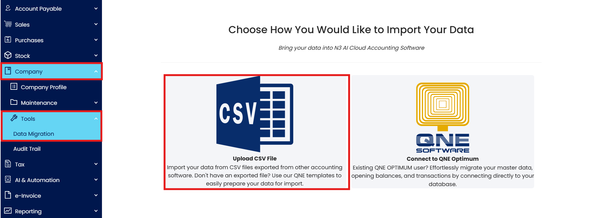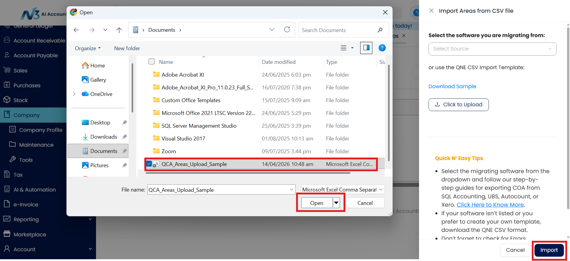 In this guide, you will learn how to import area information into the N3 AI Accounting (formerly QNE AI Cloud Accounting). Areas play a crucial role in organizing your business operations, such as categorizing regions for sales or reporting. This guide will provide step-by-step instructions on how to prepare your CSV file and successfully upload area data into the system, ensuring your records are organized and up-to-date for better reporting and operational management.